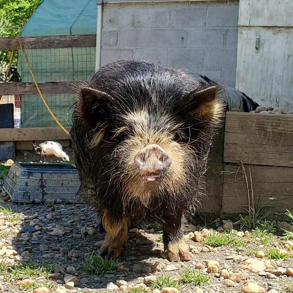 Paisano is a character. Always the first to alert us to dinner time he is the most vocal of our herd and quite the chatterbox. He is a very playful pig with the personality of a cat.