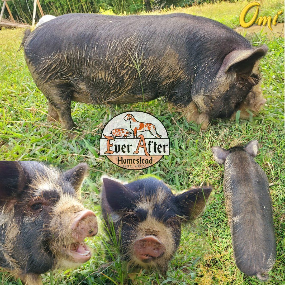 The Ever After Kune Kune herd started with Sally and Mahia Love lines, both lines known to produce larger kunes. As we learned more about Kune Kunes from our mentors and fellow breeders, we were able to determine exactly what we wanted from these wonderful pigs that can serve as pets, pasture keepers or meat. With the aim of becoming more self-sufficient, we shifted our approach to focus on keeping a smaller herd with a focus on healthy growth rates and conformation, primarily as meat pigs.
