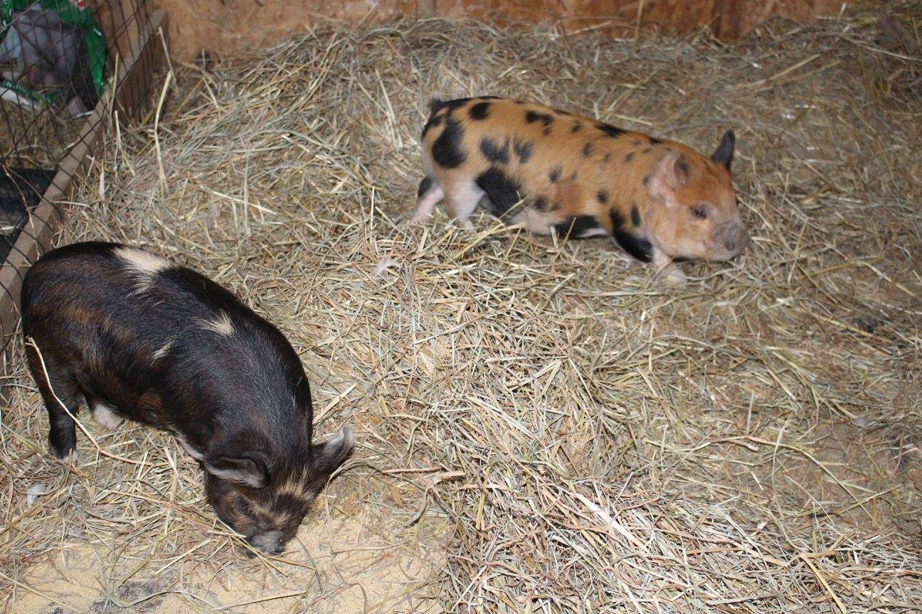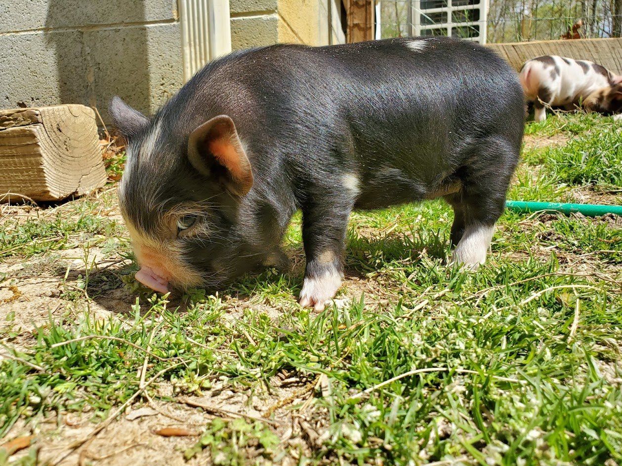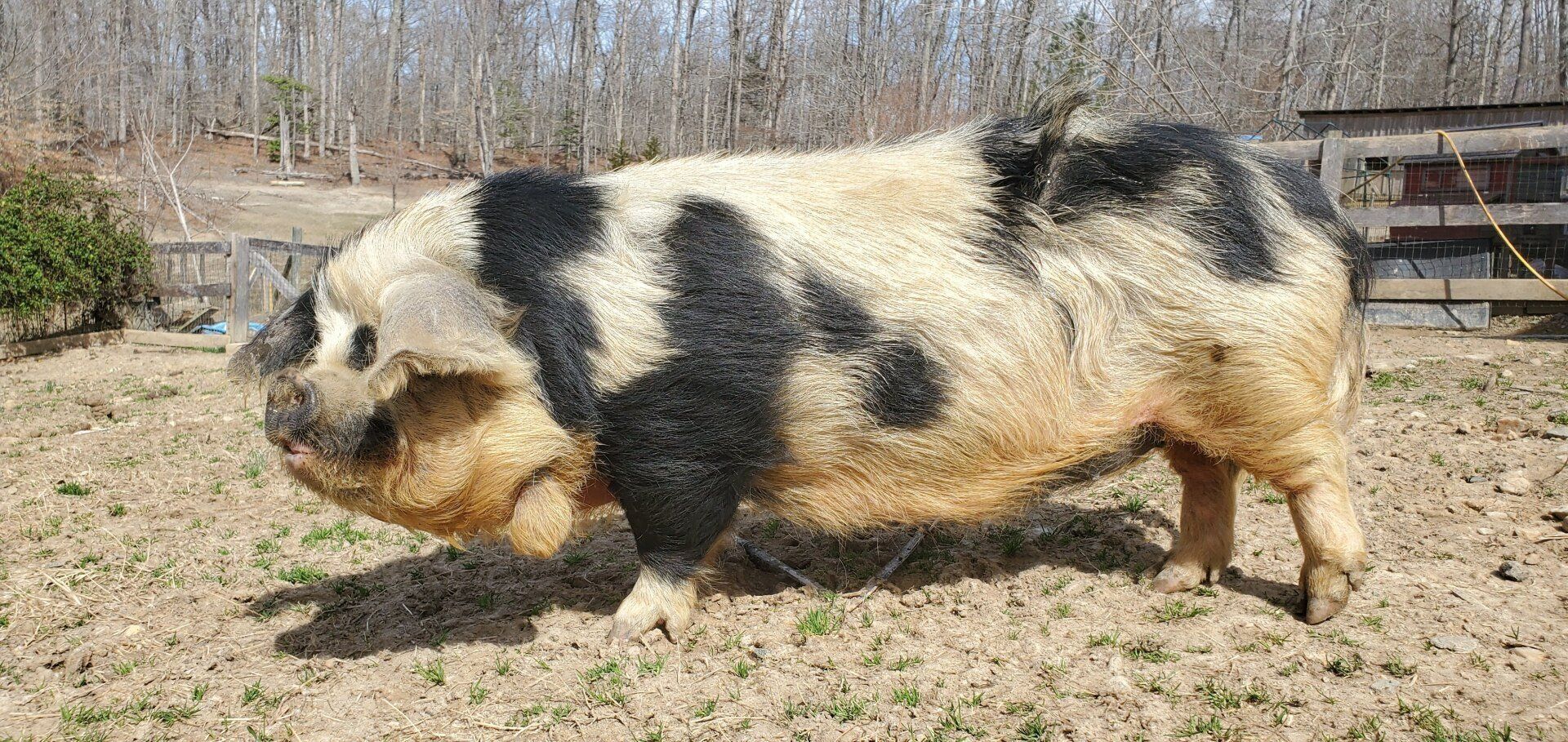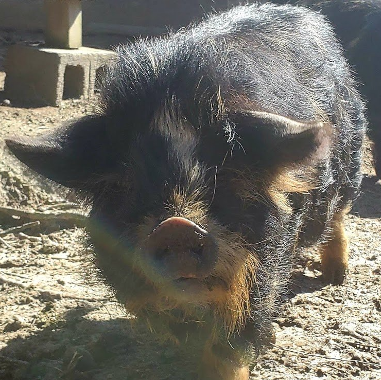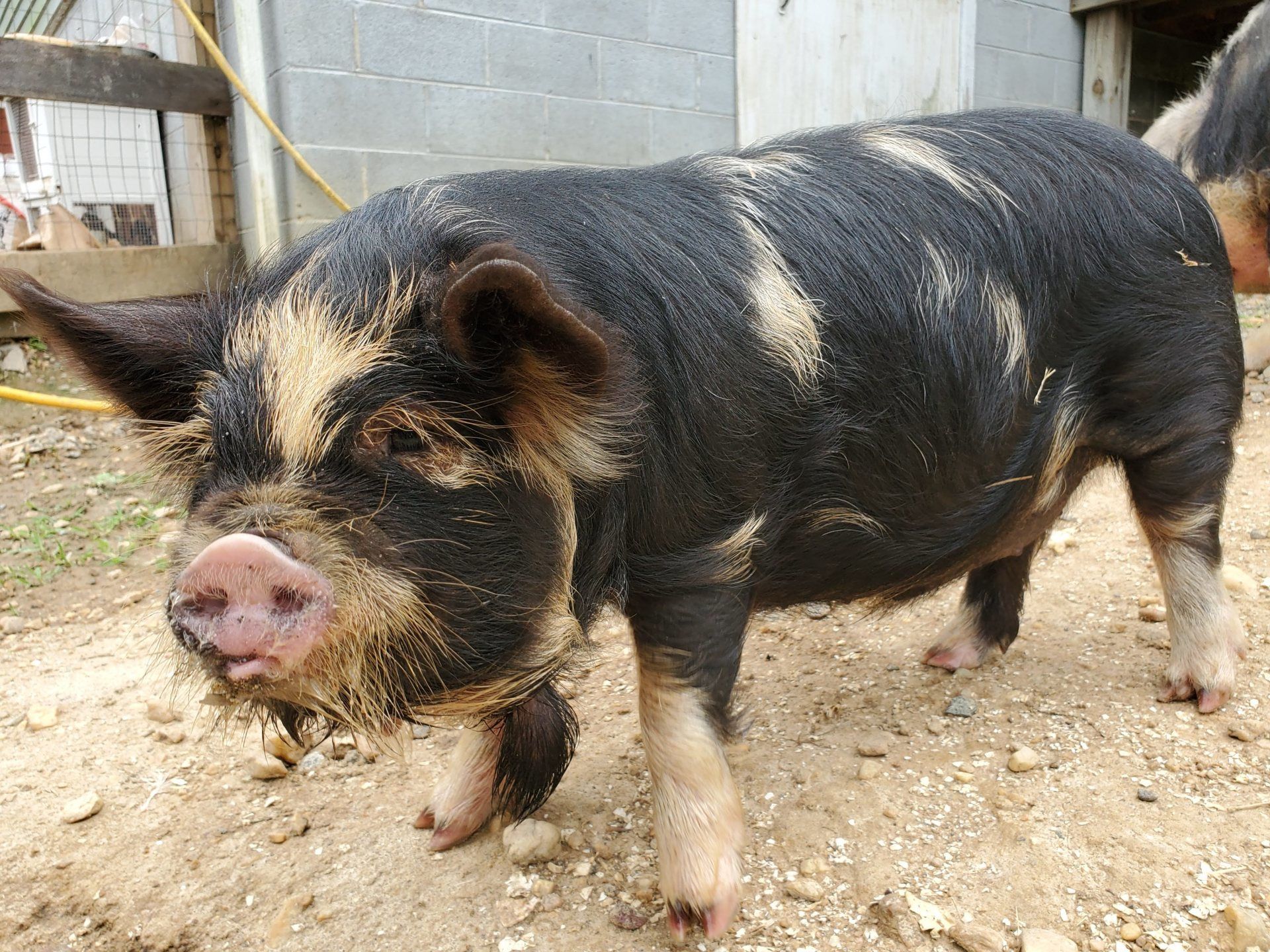 Evan is a very sweet friendly barrow that loves his people. He's much more of a people-pig and loves following you every where. Compared to our other pigs, he is very much on the smaller side.
