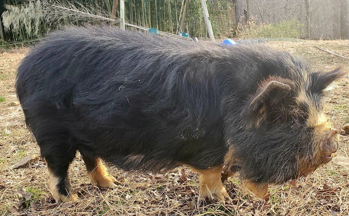 Kune Kune pigs are a breed of grazing pigs that originated in New Zealand. They are smaller breed of pigs, boars usually ranging from 150-275lbs, and are known for their docile and friendly temperaments. They are excellent grazers and are less prone to rooting due to their short upturned snouts. Their friendly behavior make them very easy to handle and perfect for small hobby farms and homesteads both as grazers and pasture tenders, but also for meat production.