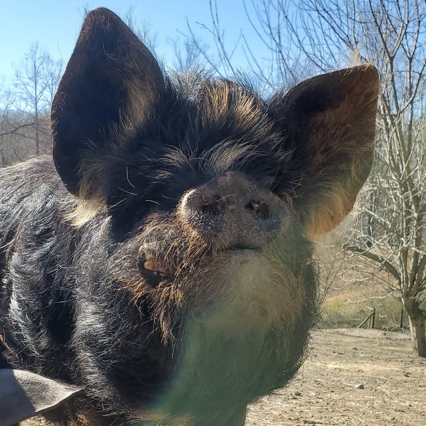 Evan is deaf and has a tendency to wander off on his own away from his herd because of it. While it gives him the impression of being a loner, this could not be further from the truth. He has been picked on by the bigger ones and instead prefers to be a nanny to the younger pigs. He has helped raise all the newly weaned boars adjust to moving to a new pasture with the others.